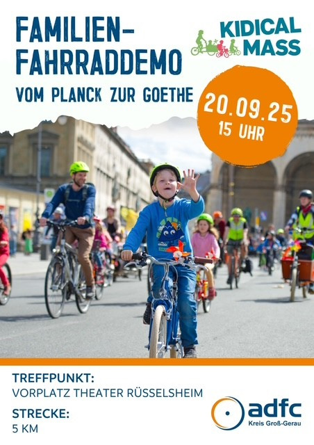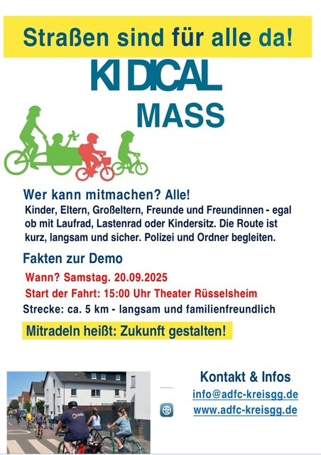 am Samstag, den 20. September 2025, findet anlässlich des Weltkindertags in Rüsselsheim die Familien-FahrradDemo „Kidical Mass“ statt. Unter dem Motto „Straßen sind für alle da“ möchten wir ein starkes Zeichen für sichere und kinderfreundliche Wege setzen.